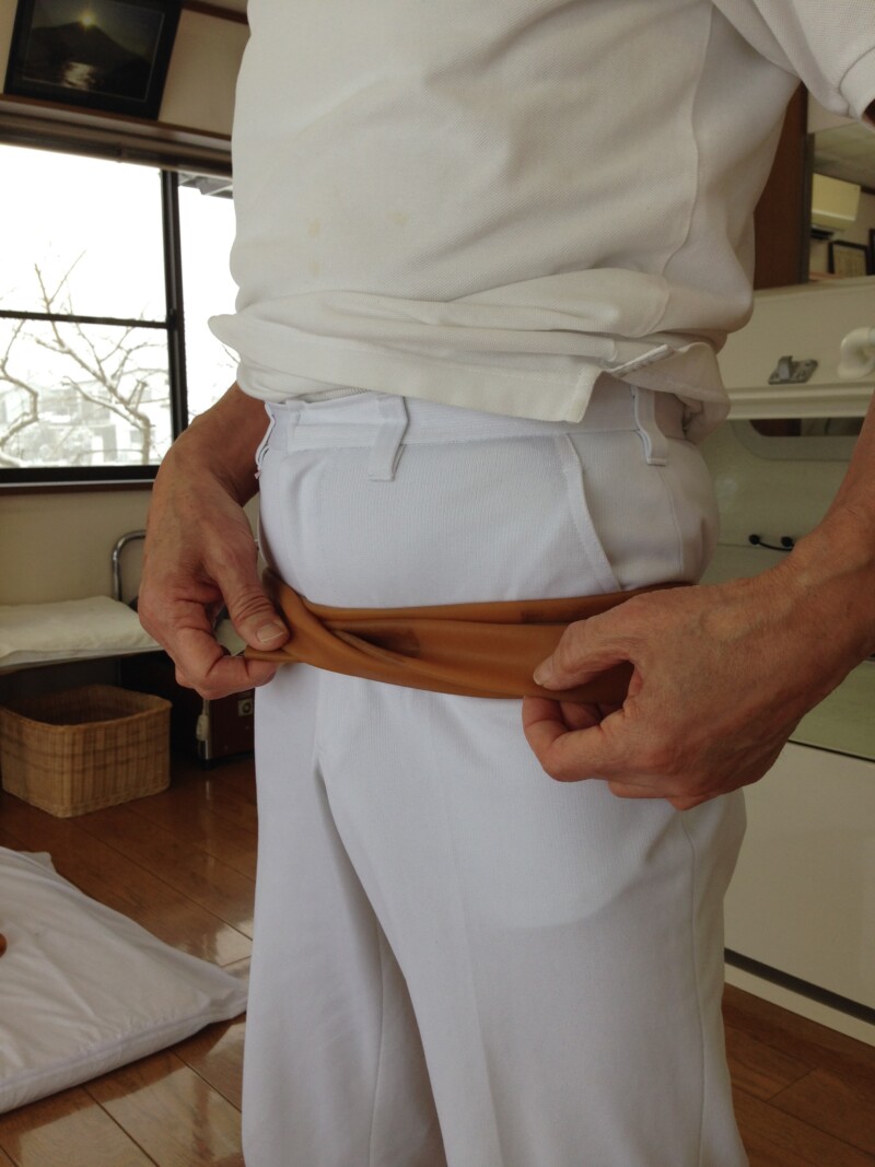 骨盤にゴムチューブを巻いて行う腰回し体操