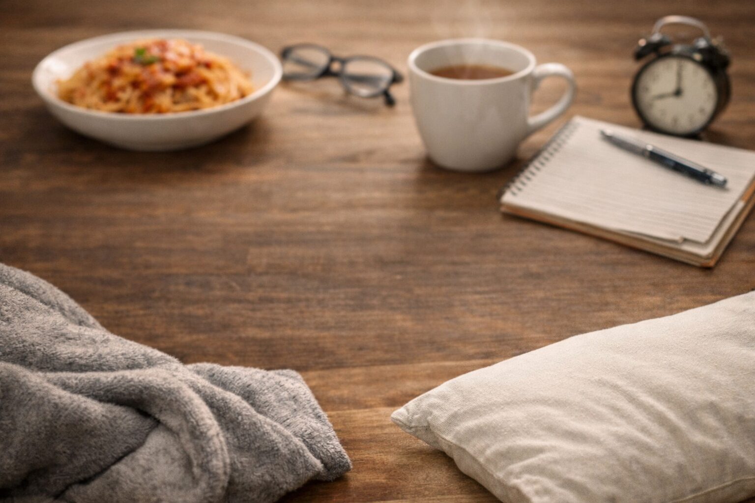 夕方の食欲の正体をテーマにしたブログ記事用アイキャッチ画像です。パスタ、温かいお茶、ノート、眼鏡、時計を配置し、夕方の中途半端な時間に感じる「食べたい」と「休みたい」のあいだの気持ちを、静かな雰囲気で表現しています。